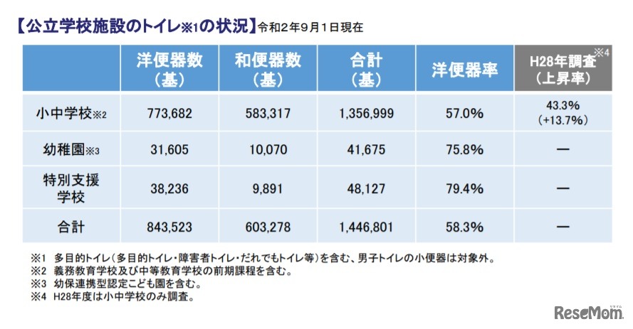 文部科学省は2020年(令和2年)9月30日、「公立学校施設のトイレ状況について」表した。2020年9月1日時点の公立小中学校におけるトイレの便器は、洋便器が57.0%、和便器が43.0%であった。和便器よりも洋便器を多く設置する方針の学校設置者は全体の約88%にのぼる。