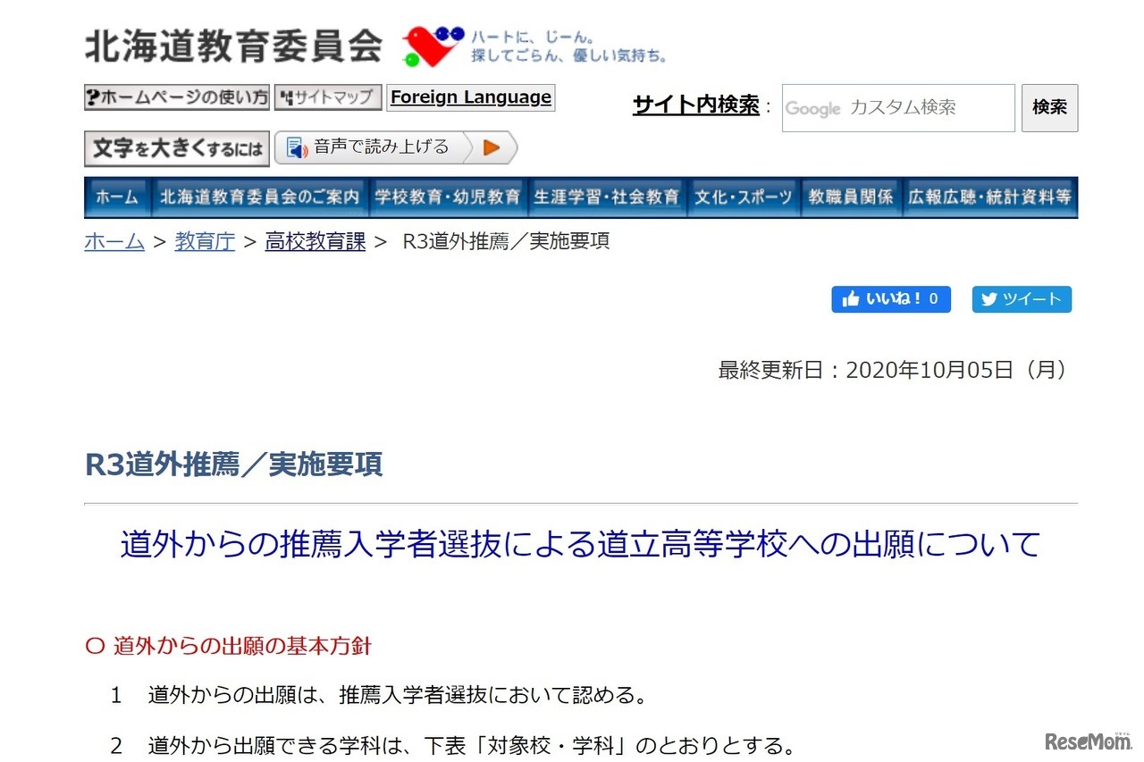 北海道教育委員会は2020年10月5日、道外からの推薦入学者選抜による道立高等学校への出願について公表した。出願受付期間は2021年1月19日から22日正午、面接実施日は2月10日。