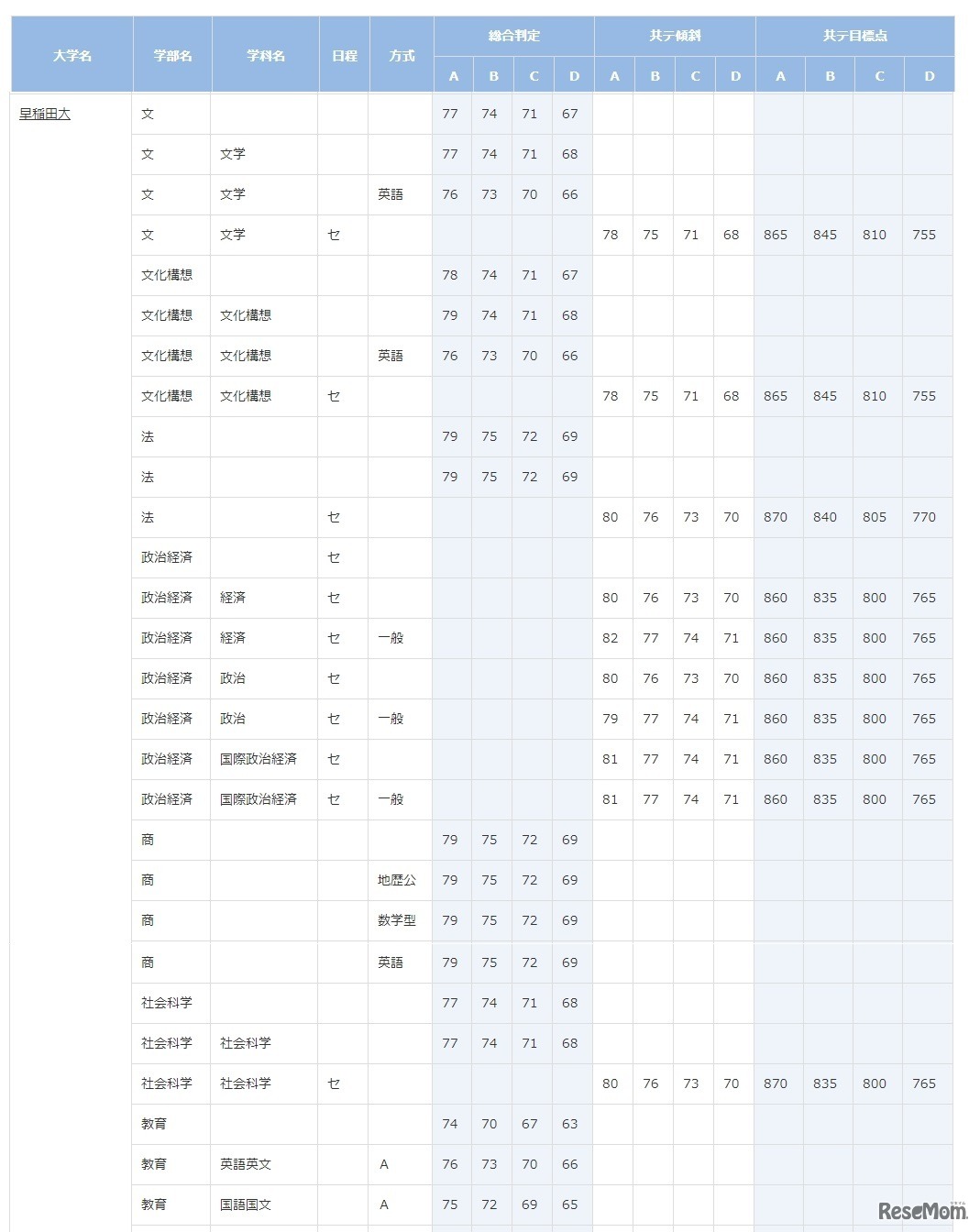 画像出典:マナビジョン 進研模試合格可能性判定基準 第1回ベネッセ・駿台大学入学共通テスト模試 早稲田大学(一部)