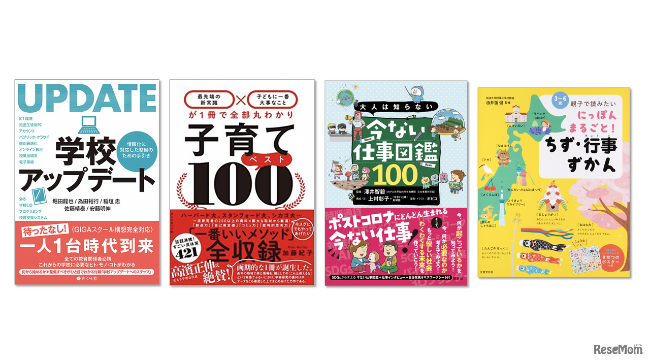 リセマム10周年記念クイズスタンプラリーの特典:「学校アップデートーー情報化に対応した整備のための手引き」「子育てベスト100」「大人は知らない 今ない仕事図鑑100」「親子で読みたい にっぽんまるごと! ちず・行事ずかん」