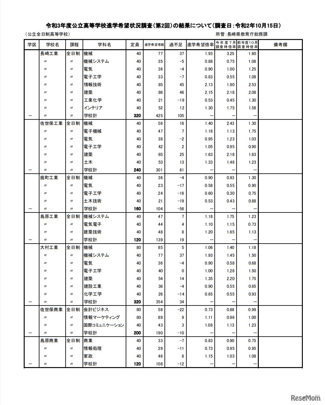 【高校受験2021】長崎県公立高校、進学希望調査・倍率(10/15時点)長崎工業(建築)2.15倍など 3枚目の写真・画像