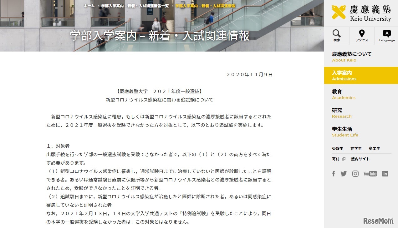 慶應義塾大学は2020年11月9日、2021年度一般選抜において、新型コロナウイルス感染症に罹患し受験できなかった人を対象に追試験を実施することを公表した。追試験日は2021年3月9日。
