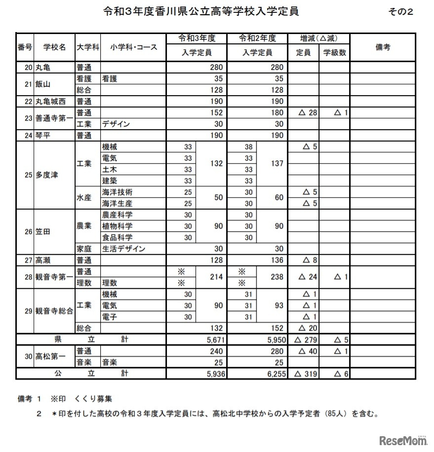 香川県教育委員会は2020年11月、2021年度(令和3年度)公立高等学校入学定員について公表した。全日制課程は、前年度(2020年度)よりも319人少ない5,936人を募集する。高松(普通)280人、高松第一(普通)240人と、いずれも前年度(2020年度)より40人減。