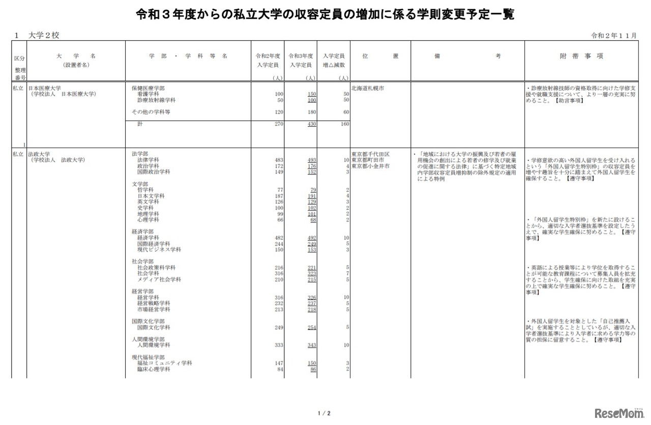 文部科学省は2020年11月18日、2021年度(令和3年度)からの私立大学の収容定員の増加に係る学則変更予定一覧を公表した。今回定員増が公表されたのは、日本医療大学と法政大学の2校。日本医療大学は160人、法政大学は164人の定員増となる。