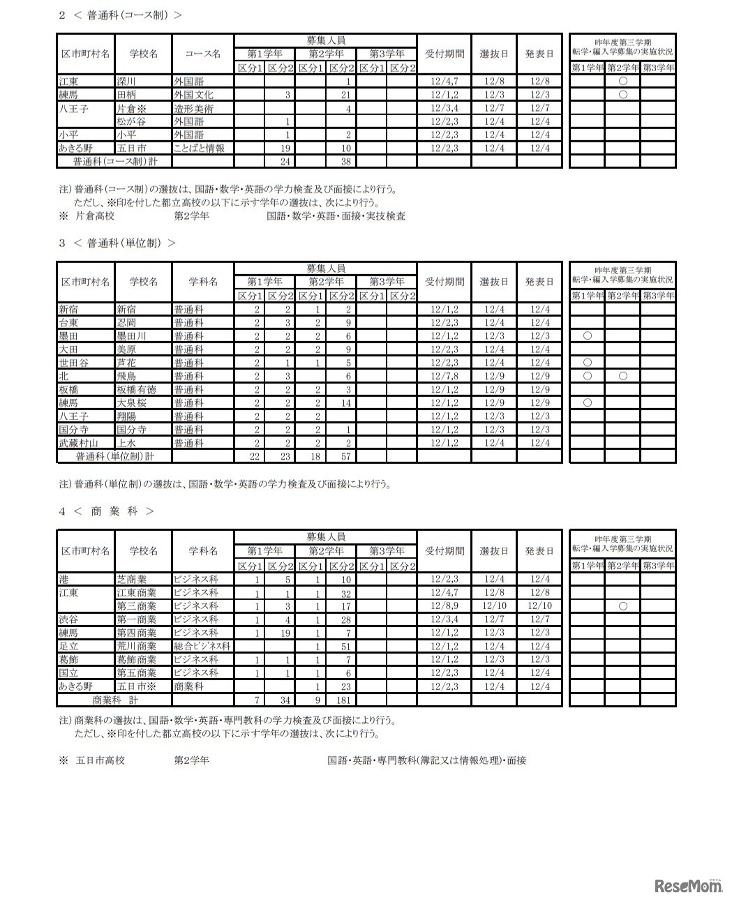 画像出典:東京都教育委員会 第3学期転学・編入学募集(全日制課程)