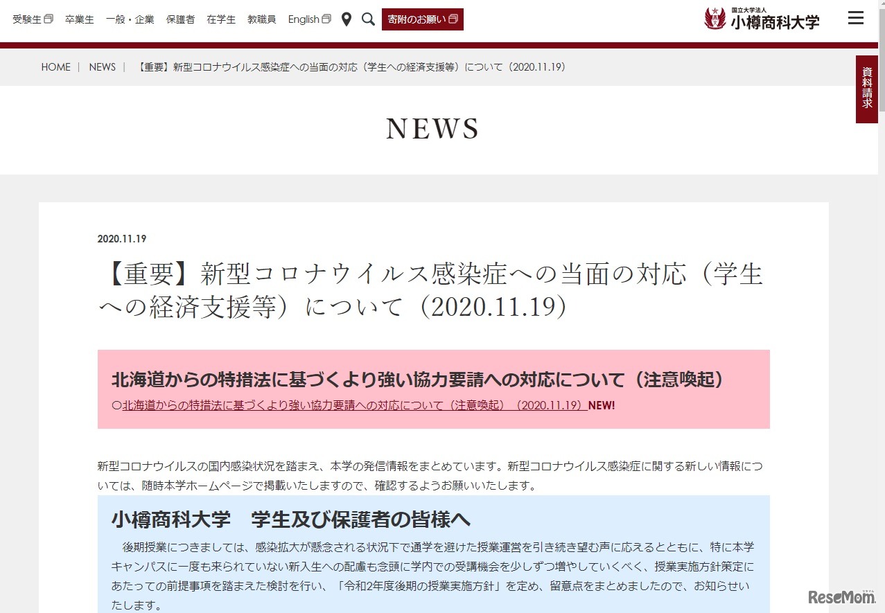 小樽商科大学は2020年11月19日、急増している新型コロナウイルス感染症の対応として、学生などに札幌市すすきの地区などの繁華街への外出を控えるなどを呼び掛けた。北海道大学も大学の行動指針のレベルを上げ、課外活動の禁止を決めている。