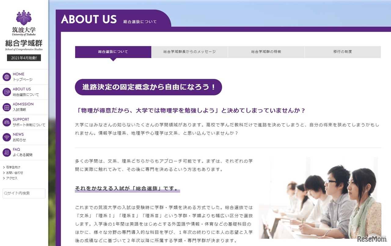筑波大学は、2021年(令和3年)度の一般選抜・前期日程に「総合選抜」を導入する。大学のWebサイトでは募集要項を掲載するほか、新しい学群となる「総合学域群」の特徴や「総合選抜」について詳細を公開している。