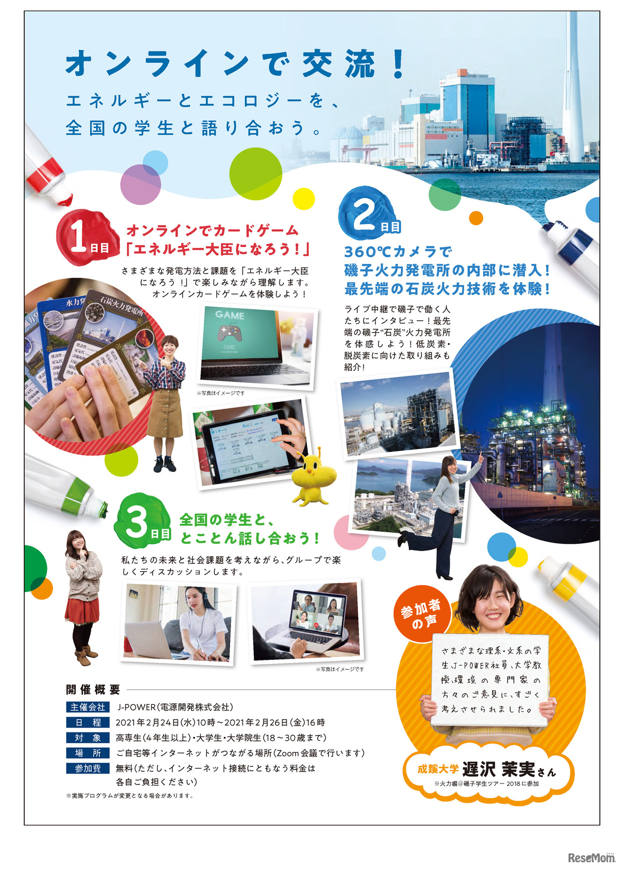 J-POWER(電源開発)は2021年2月24日から26日の3日間、「エコ×エネ体験ツアー火力編@オンライン」を開催する。環境問題や今後のエネルギーのあり方、科学技術や私たちの暮らしについて学び合う。参加は無料。対象は高専(4年生以上)、大学、大学院に在籍している学生。