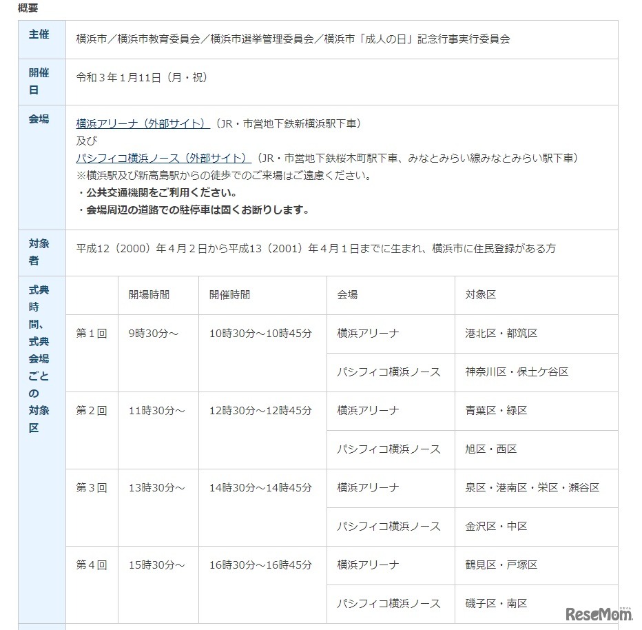 札幌市は2020年11月30日、2021年1月の成人式の中止を発表した。札幌市内における新型コロナウイルスの急速な感染拡大を受けたもの。政令指定都市では横浜市が中止を発表後、市民の要望を受け開催に再変更している。大阪市は各区で時間を分けて開催する。