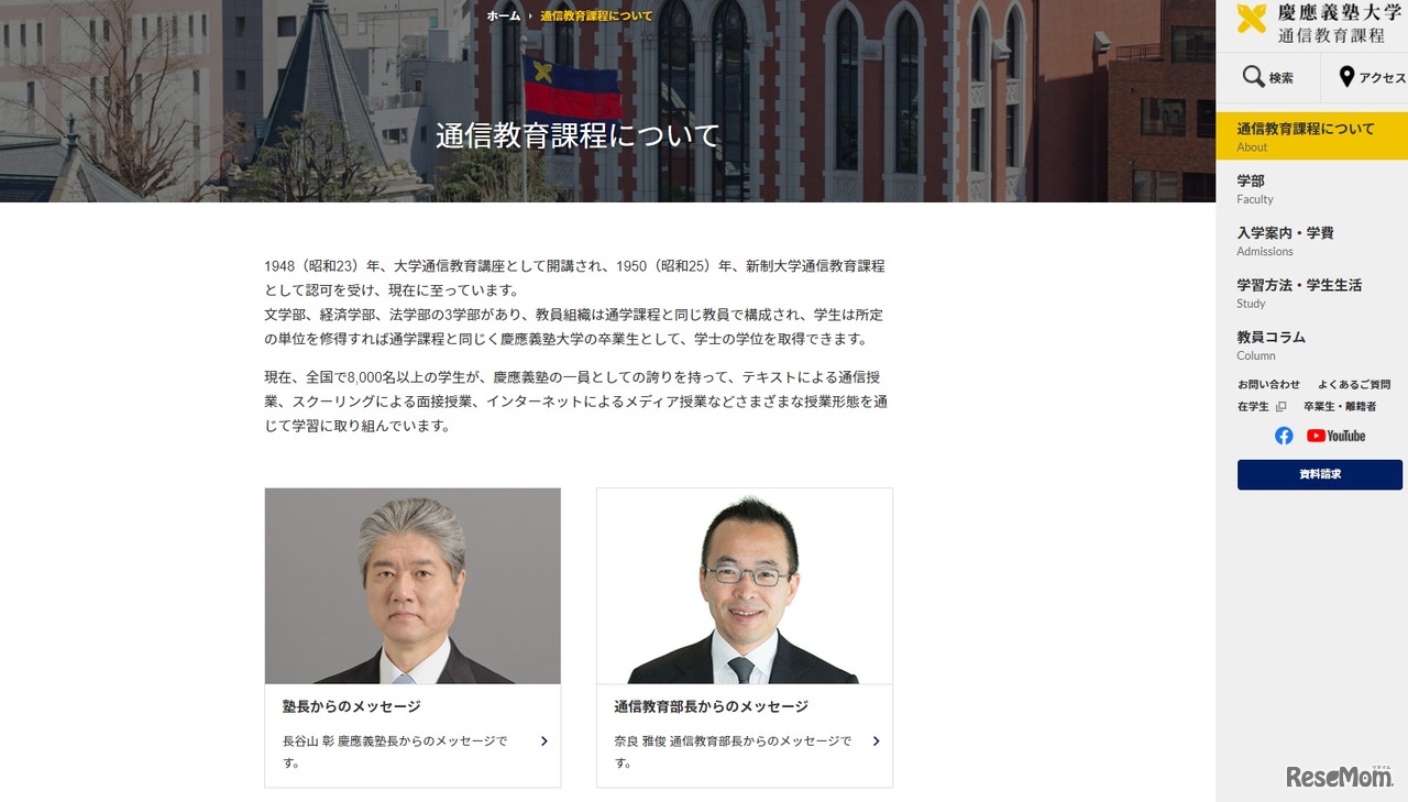 慶應義塾大学は、2021年4月期入学の通信教育課程「Web入学説明会」を2020年12月1日~2021年3月3日に開催する。授業体験やキャンパス紹介などを行うほか、12月18日まで実施するアンケートに回答すると先着1,000人に正科生対象の入学案内を無料で送付する。
