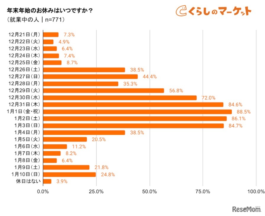 くらしのマーケットは2020年11月25日、「年末年始の過ごし方」に対するアンケート調査の結果を公表した。年末年始休暇の“分散取得”予定者は1割未満で、約8割が「自宅でゆっくりする」と回答した。