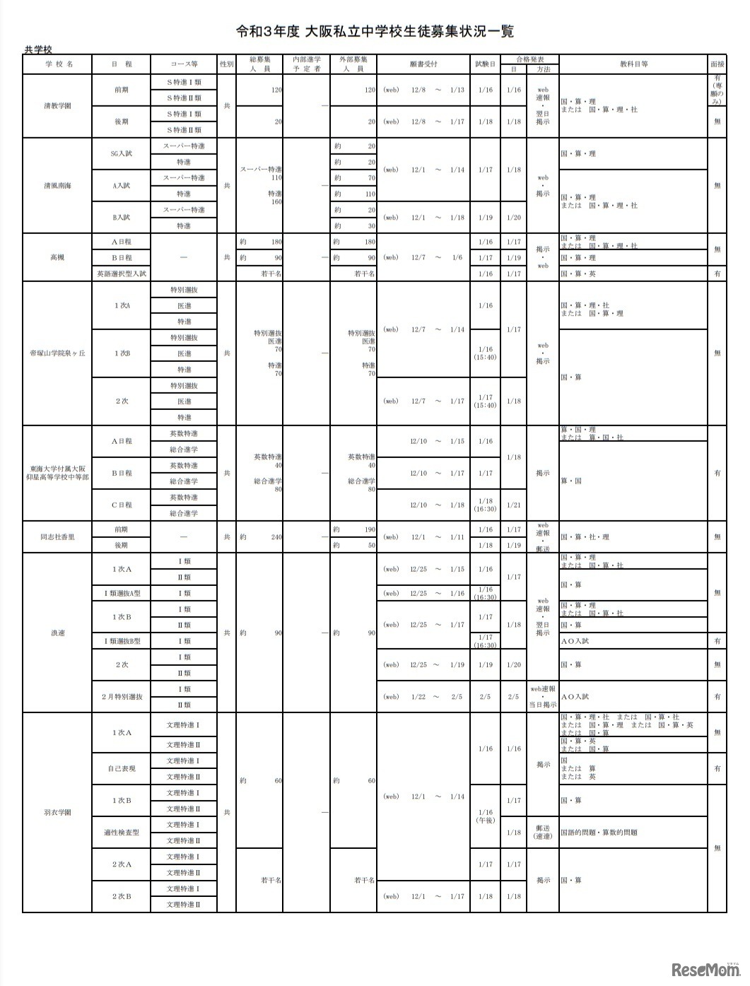 画像出典:大阪私立中学校高等学校連合会 令和3年度大阪私立中学校生徒募集状況一覧