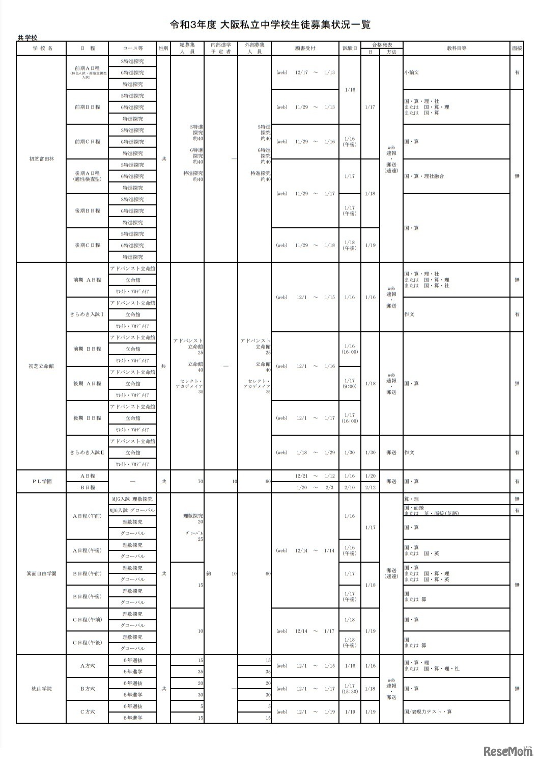 画像出典:大阪私立中学校高等学校連合会 令和3年度大阪私立中学校生徒募集状況一覧