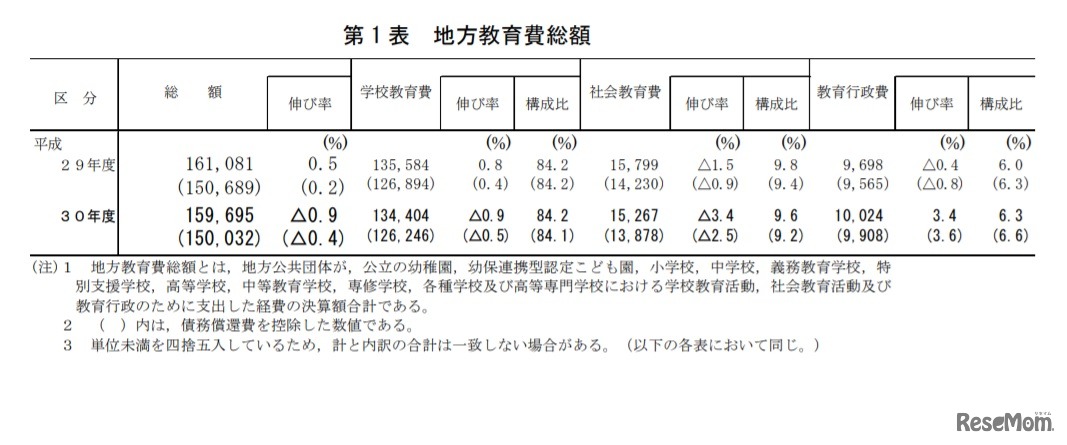 文部科学省は2020年12月2日、「2019年度(令和元年度)地方教育費調査」の確定値を公表した。2018年度(平成30年度)に支出された地方教育費総額は、前年度(2017年度)比1,386億円(0.9%)減の15兆9,695億円と、2年ぶりに減少している。