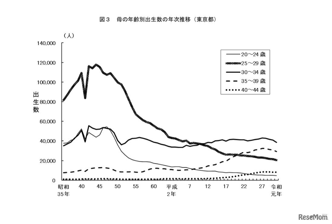 画像出典:東京都「令和元年 東京都人口動態統計年報(確定数)」 母の年齢別出生数の年次推移(東京都)