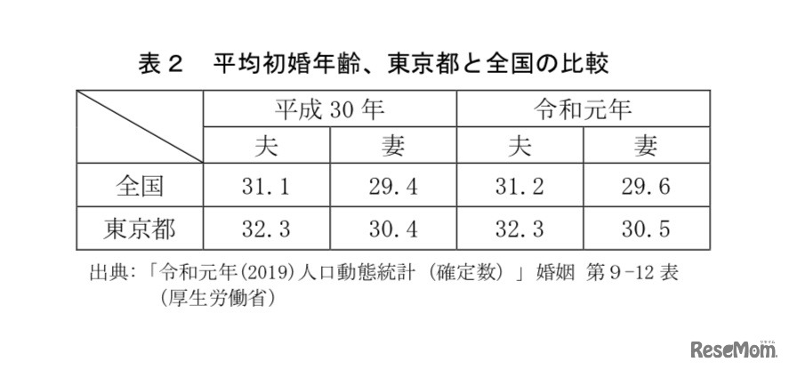 画像出典:東京都「令和元年 東京都人口動態統計年報(確定数)」 平均初婚年齢、東京都と全国の比較