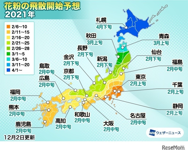 ウェザーニューズは2020年12月2日、2021年花粉シーズンの「第二回花粉飛散傾向」を発表した。スギ花粉は2月上旬に関東から飛散を開始し、ピークは2月下旬からと予想している。
