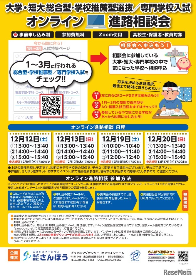 さんぽうは、「大学・短大総合型・学校推薦型選抜/専門学校入試 オンライン進路相談会」を12月12日・13日・19日・20日に開催する。Zoomを利用し、2021年1月~3月に実施される推薦入試などを確認できる。