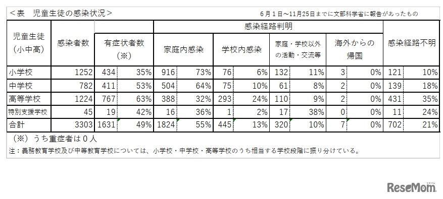 文部科学省は2020年12月3日、学校のおける新型コロナウイルス感染症の現状と分析について発表した。感染経路が「学校内」だった割合は、小学生が6%、中学生が10%、高校生が24%で、家庭内感染が小中学生の約7割を占めていることが明らかになった。