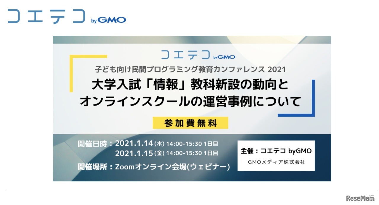 プログラミング教育ポータルサイト「コエテコ byGMO」は2021年1月14日・15日、「子ども向け民間プログラミング教育カンファレンス 2021」をオンライン開催する。参加は無料。2020年12月3日よりWebサイトにて申込みを受け付けている。