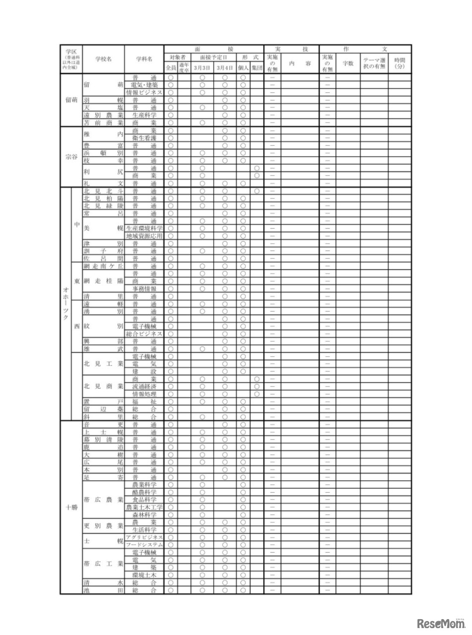 北海道教育委員会は2020年12月4日、2021年度(令和3年度)「公立高校一般入学者選抜における面接・実技・作文の実施予定一覧表」および「公立高校推薦入学者選抜における面接以外に実施する項目の実施予定一覧表」を公開した。