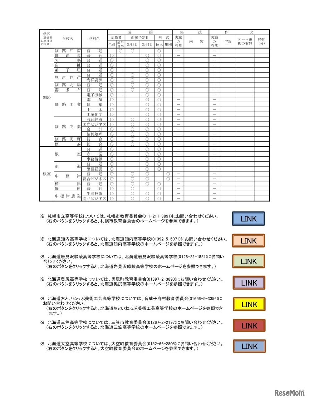 画像出典:北海道教育委員会 令和3年度(2021年度)公立高等学校一般入学者選抜における面接・実技・作文の実施予定一覧
