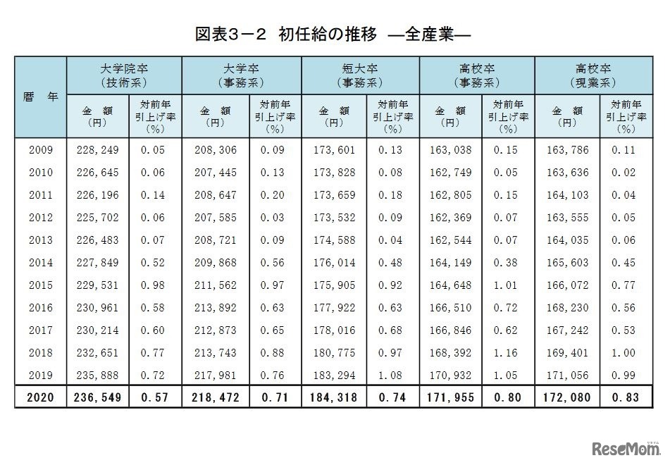 大卒事務系の初任給21万8,472円、引上げ率は下方へシフト 5枚目の写真・画像