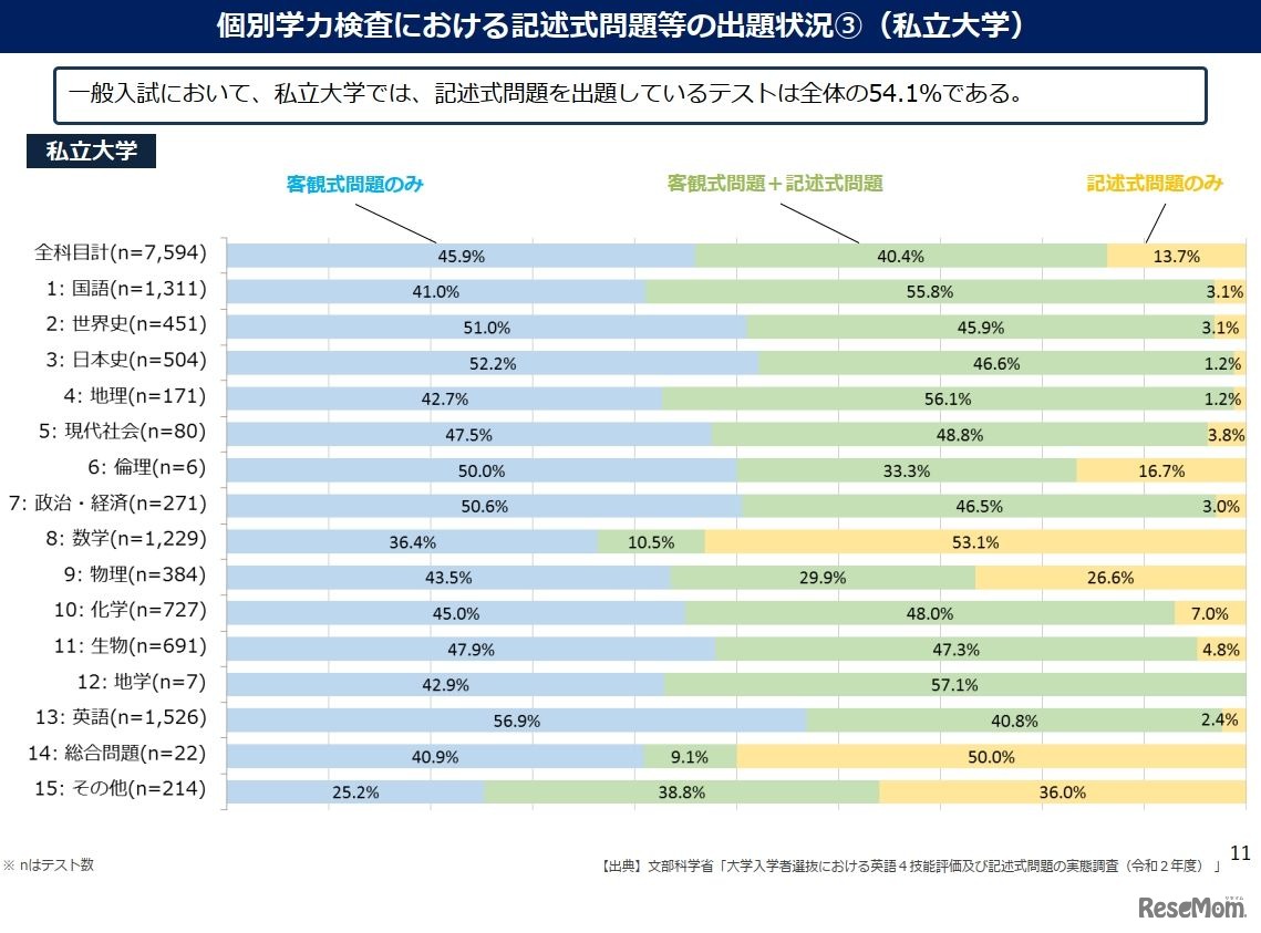 2020年度大学入試(一般入試)における記述式問題の出題状況は、国立大学が99.4%、公立大学が98.5%、私立大学が54.1%だったことが、文部科学省の調査結果より明らかになった。