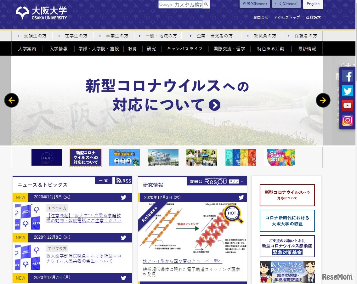 大阪教育大学は2020年12月7日、大阪府が12月3日に新型コロナウイルス感染症の警戒を促すステージを「レッドテージ(非常事態)1」に引き上げたことから、学生に対し不要不急の外出自粛を要請。大阪大学や関西大学も学生に感染予防策の徹底を呼び掛けている。