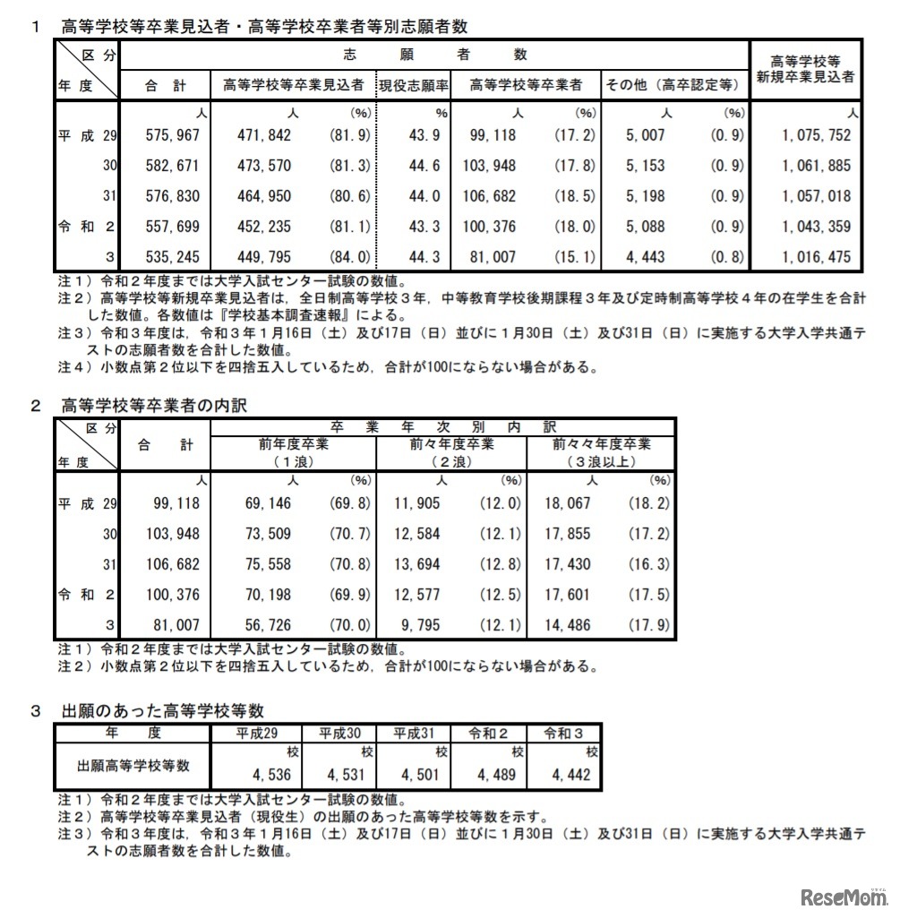 画像出典:大学入試センター「令和3年度大学入学共通テストの志願者数等について」 大学入試センター試験・大学入学共通テストに関連する数値の推移