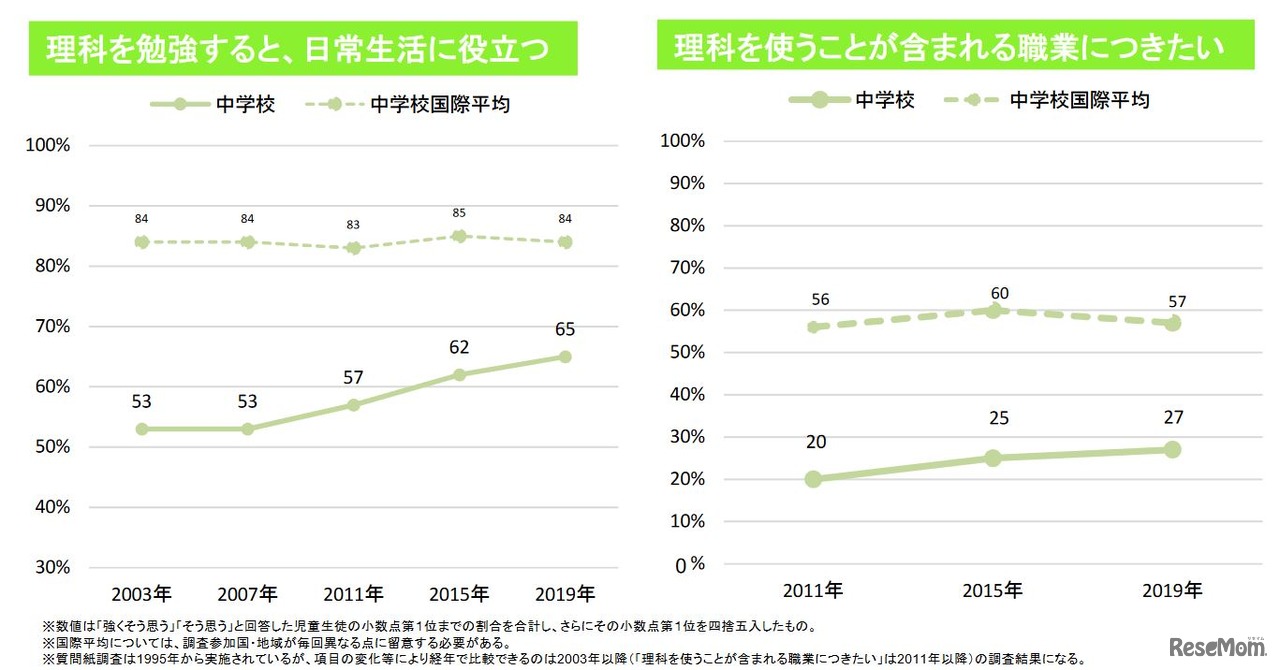 画像出典:文部科学省、国立教育政策研究所「国際数学・理科教育動向調査(TIMSS2019)のポイント」 「理科を勉強すると、日常生活に役立つ」「理科を使うことが含まれる職業につきたい」と答えた生徒の割合
