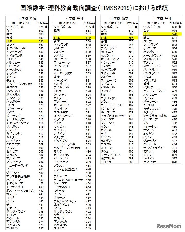 文部科学省と国立教育政策研究所は2020年12月8日、国際教育到達度評価学会(IEA)が進める「国際数学・理科教育動向調査(TIMSS)」の調査結果を公表した。日本は、小学校理科の平均得点が下がったものの、小中学校ともにすべての教科で5位以内と高い水準を維持した。