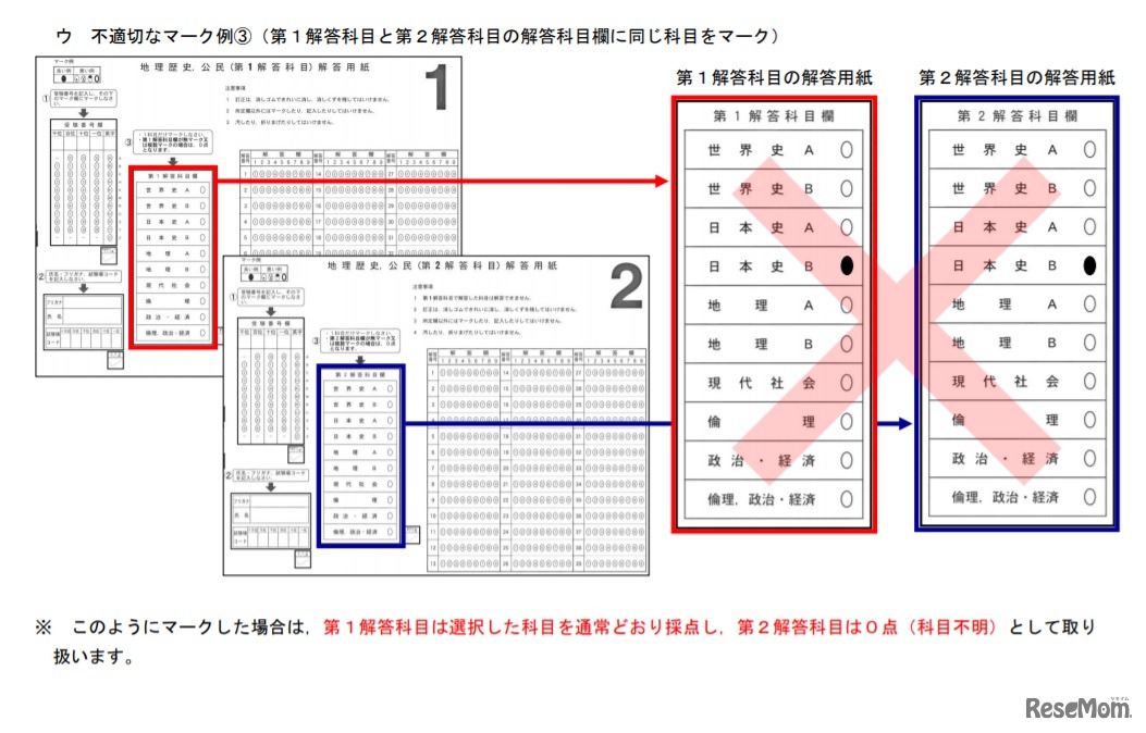 大学入試センターは2020年12月8日、2021年度(令和3年度)試験情報の「受験上の注意」に「試験問題冊子の注意事項等について」「解答科目欄の不適切なマーク例」を掲載した。