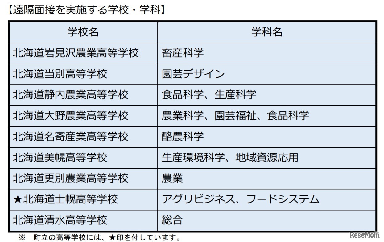 北海道教育委員会は、新型コロナウイルス感染症拡大防止の観点から、令和3年度(2021年度)の推薦入試では、通信機器を活用した遠隔面接を実施することができることとした。遠隔面接を実施する学校は、岩見沢農業(畜産科学)・当別(園芸デザイン)など9校。