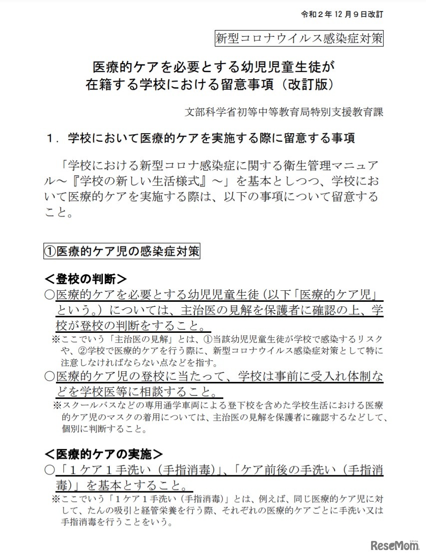 文部科学省は2020年12月9日、新型コロナウイルス感染症対策として「医療的ケアを必要とする幼児児童生徒が在籍する学校における留意事項(改訂版)」をWebサイトに掲載した。