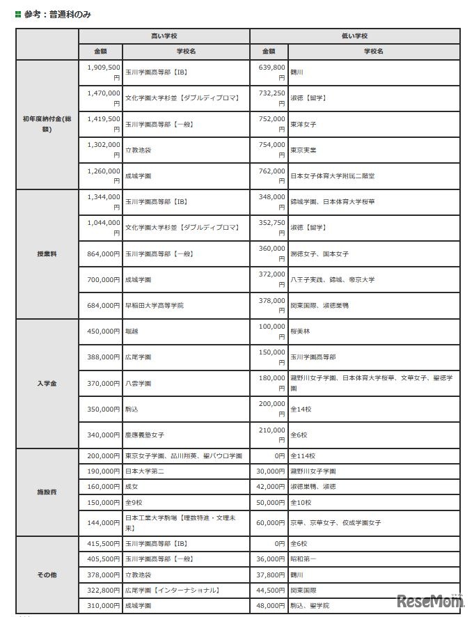 画像出典:東京都 初年度納付金の高い学校、低い学校(普通科)