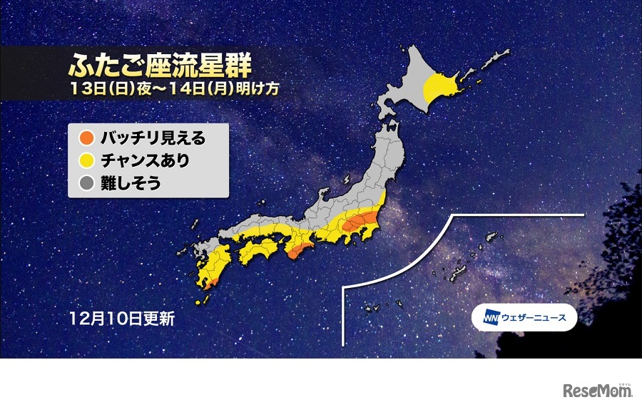 三大流星群のひとつである「ふたご座流星群」が、2020年12月13日夜から14日の明け方にかけて見頃となる。ウェザーニュースLiVEでは特別番組を実施し、国内4か所から空のようすを生中継する。