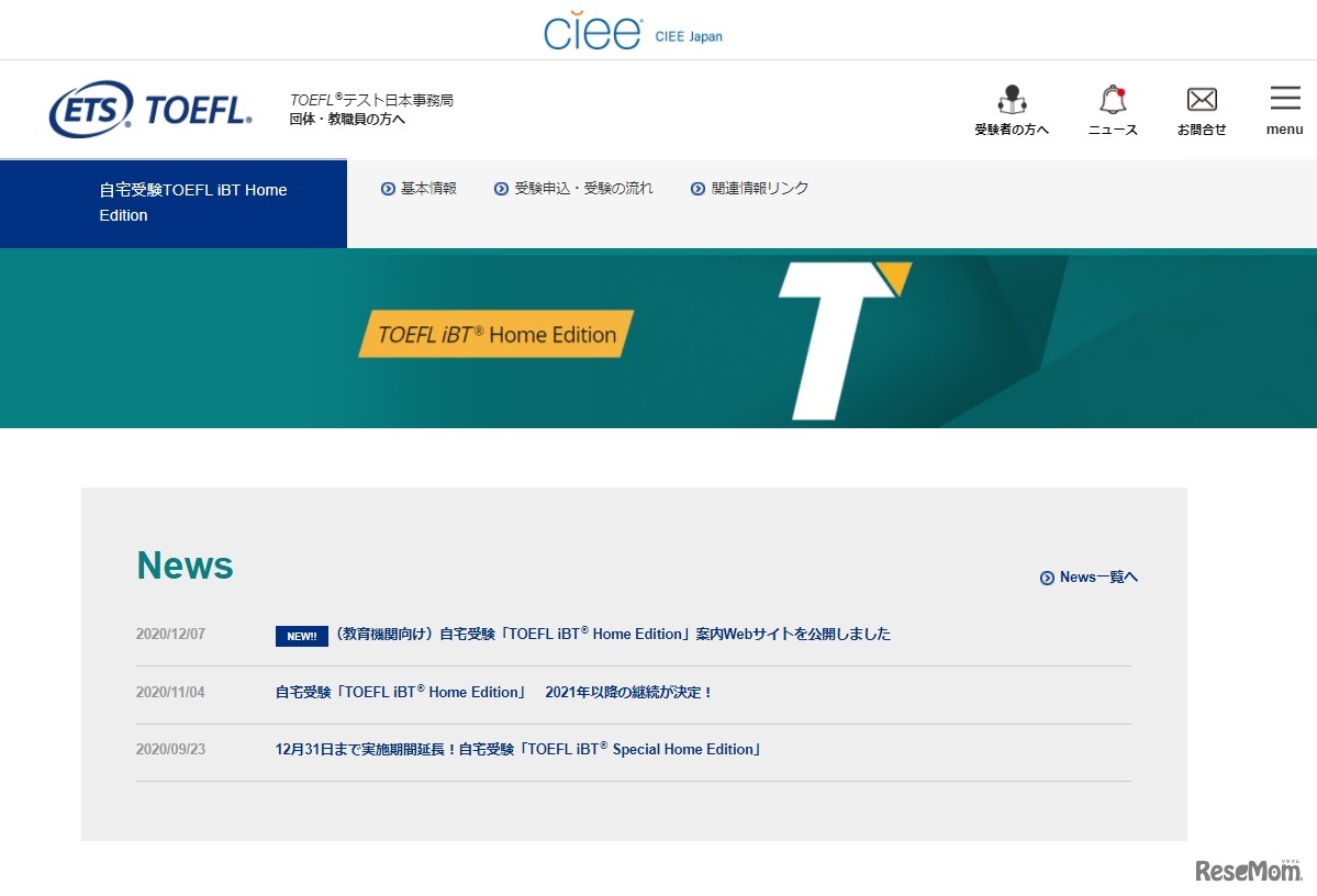 TOEFLテスト主催団体ETSは2020年12月7日、新型コロナウイルス感染防止の対応策として提供している自宅受験「TOEFL iBT Home Edition」の教育機関向け案内サイトを公開した。