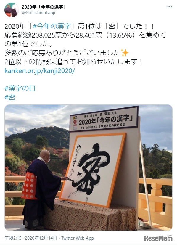 日本漢字能力検定協会は2020年12月14日、今年の世相を漢字一字で表現する年末の風物詩「今年の漢字」を発表した。京都・清水寺の森清範貫主が揮毫した漢字一字は「密」。