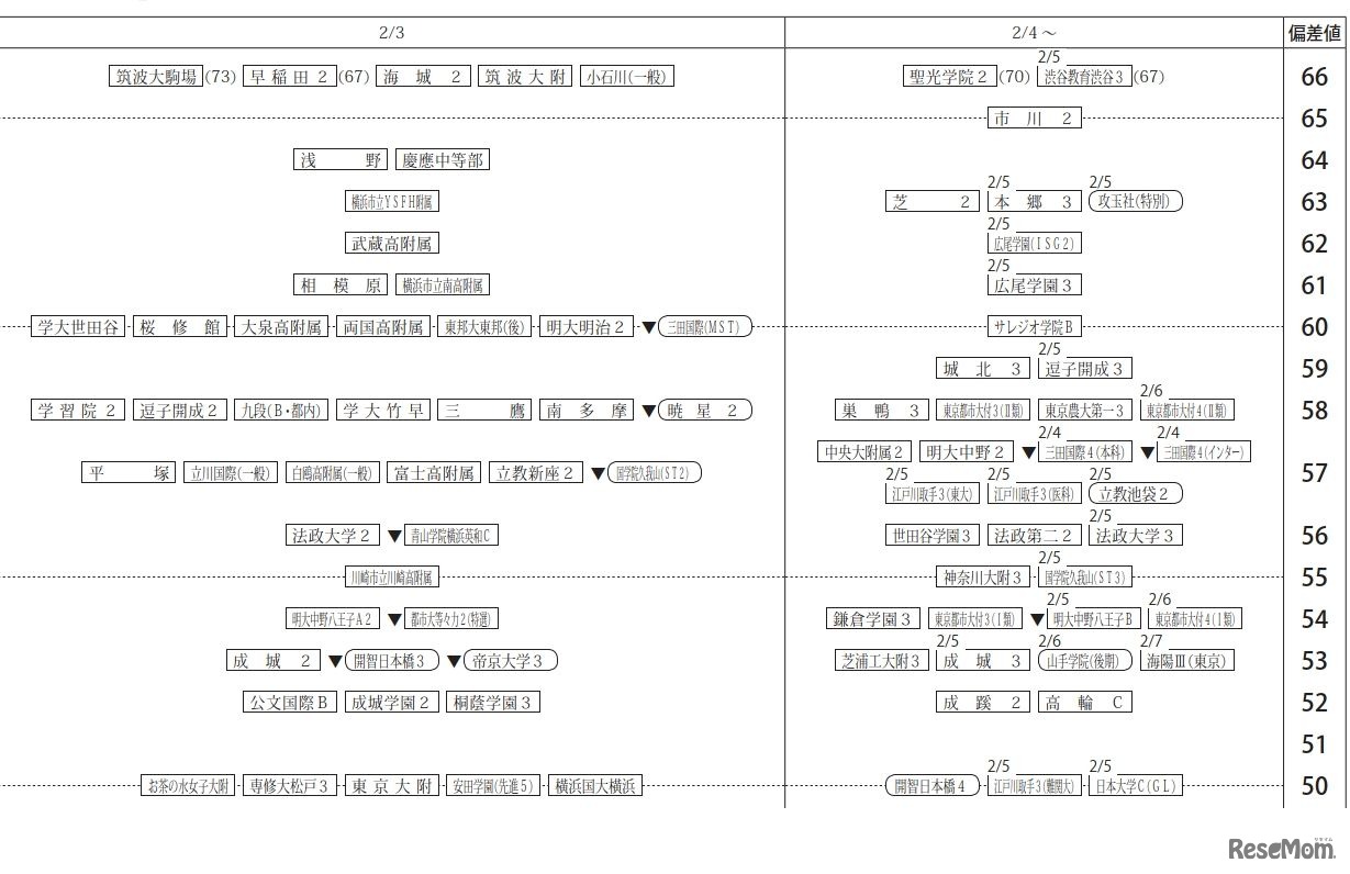 四谷大塚は、2020年12月6日に実施した小学6年生対象「第6回合不合判定テスト」の偏差値一覧を公表した。難関校の合格可能性80%偏差値は、男子が筑波大駒場(73)、開成(71)、女子が桜蔭(70)、女子学院(70)など。