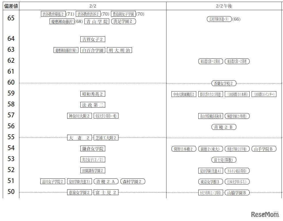 画像出典:四谷大塚「第6回 合不合判定テスト」結果偏差値 2月2日女子の80偏差値