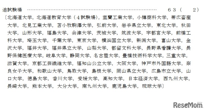 大学入試センターは2020年12月16日、令和3年度(2021年度)大学入学共通テストの「追試験場一覧」と「特例追試験場一覧」を公表した。本試験場681か所のほか、追試験場63か所と特例追試験場2か所を設ける。