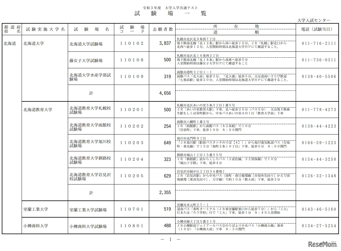大学入試センターは2020年12月16日、令和3年度(2021年度)大学入学共通テストの「追試験場一覧」と「特例追試験場一覧」を公表した。本試験場681か所のほか、追試験場63か所と特例追試験場2か所を設ける。