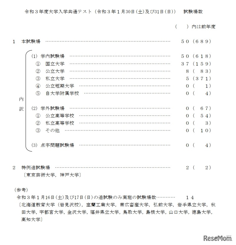 大学入試センターは2020年12月16日、令和3年度(2021年度)大学入学共通テストの「追試験場一覧」と「特例追試験場一覧」を公表した。本試験場681か所のほか、追試験場63か所と特例追試験場2か所を設ける。
