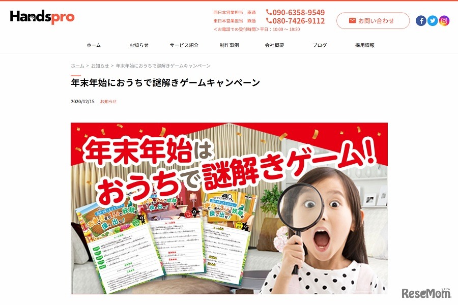 ハンズプロは、「おうちで謎解きゲーム」を年末年始に外出を控える家庭のためにキャンペーン割引価格で提供している。ひらがなやカタカナが読める就学前後の子どもから、中高生、大人まで楽しめる。キャンペーン期間は2020年12月16日から2021年1月3日まで。