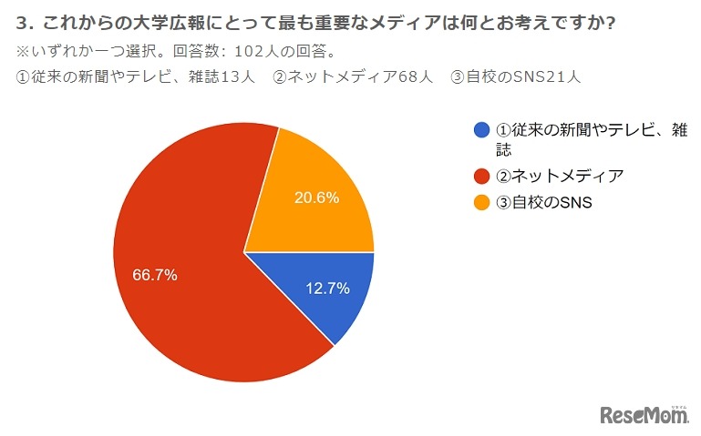 これからの大学広報に重要なメディアは、66.7%の大学が「ネットメディア」と回答し、「従来の新聞やテレビ、雑誌」は12.7%にとどまったことが、共同ピーアールの調査結果より明らかになった。
