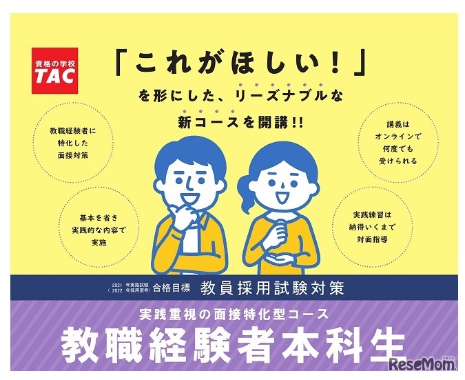 資格取得に向けた教育サービスを展開するTACは、2020年12月16日から教職経験者向けの新コース「教職経験者本科生」の申込受付を開始した。講義はWebまたはDVDで受講し、実践練習は校舎またはオンラインの練習に参加できる。