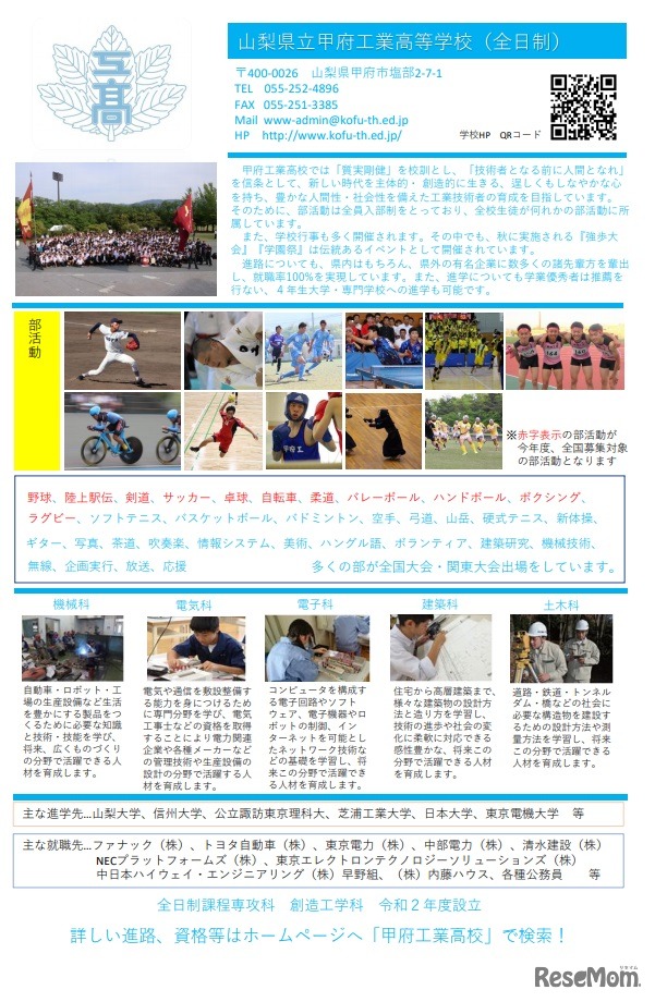 山梨県教育委員会は、2021年度(令和3年度)から県外の志願者を募る「全国募集」を前期募集で導入する。Webサイトでは全国募集の実施校や要項、入学者選抜制度などをまとめている。