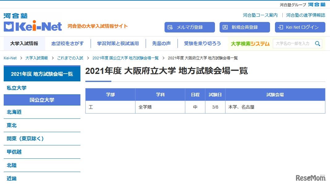 河合塾が提供する大学入試情報サイト「Kei-Net」は2020年12月21日、「2021年度国公立大学地方試験会場一覧」を掲載した。大阪府立大学や兵庫県立大学、新設の叡啓大学など、全国48校の国公立大学について地方試験会場の情報をまとめている。