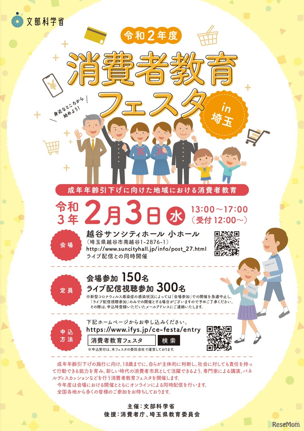 文部科学省は2021年2月3日、教員や学生らを対象に「令和2年度(2020年度)消費者教育フェスタin埼玉」を越谷サンシティホールにて開催する。テーマは「成年年齢引下げに向けた地域における消費者教育」。参加無料。